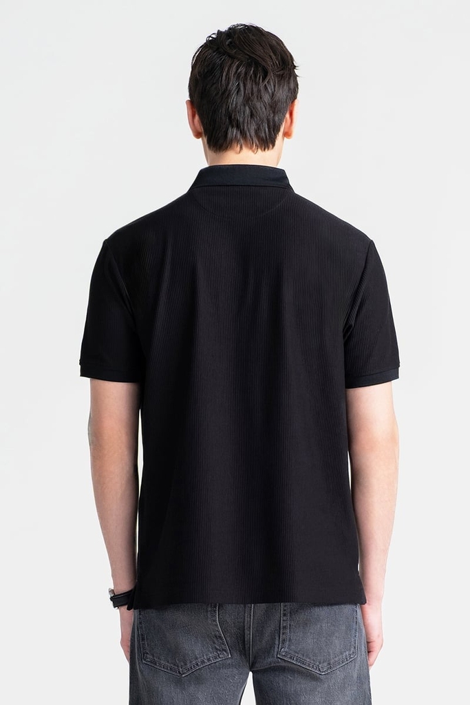 - Thiết kế cổ polo tay ngắn truyền thống, form suông vừa vặn giúp ôm dáng mà vẫn thoải mái. Bề mặt vải nổi bật với hiệu ứng sọc gân sọc, tạo điểm nhấn tinh tế nhưng không phô trương. Cổ áo được xử lý cứng cáp, giữ phom tốt – kết hợp cùng hàng nút gọn và tay áo bo nhẹ, tăng thêm vẻ lịch sự và nam tính.